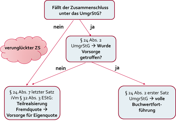 1289, 1298, 1305, 1316, 1320a, 1341, 1353, 1370, 1379, 1381, 1381a, 1417, 1422, 1428 ff, 1457a, 1458, 1506, 1507, 1508a | In den Ausführungen zu Art. IV UmgrStG werden die mit dem AbgÄG 2023 eingeführten Neuregelungen für "verunglückte Zusammenschlüsse" (§ 24 Abs. 7 EStG 1988 idF AbgÄG 2023), für Zusammenschlüsse ohne Vornahme einer Vorsorge (§ 24 Abs. 2 UmgrStG idF AbgÄG 2023) sowie für die Übertragung von nicht begünstigtem Vermögen (§ 32 Abs. 3 EStG 1988 idF AbgÄG 2023) im Rahmen von Zusammenschlüssen verarbeitet, wonach es nur (noch) zu einer Teilrealisierung von stillen Reserven im Hinblick auf die "Fremdquote" kommt. |