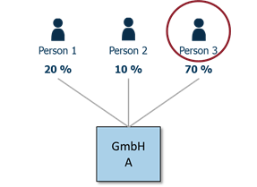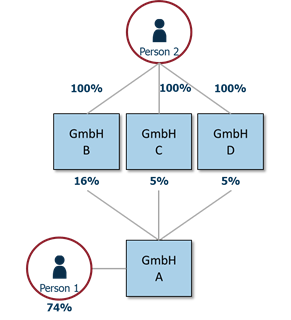Beispiel oberster Rechtsträger (Variante 1): Der oberste Rechtsträger der GmbH A ist die GmbH C, da diese von Person 1 direkt kontrolliert wird und somit indirekt das wirtschaftliche Eigentum an GmbH A von Person 1 begründet. Als Anteil am obersten Rechtsträger sind 100% anzugeben.