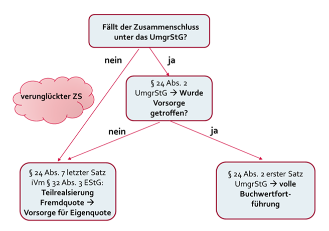 Dieselben ertragsteuerlichen Rechtsfolgen treten ein, wenn der Zusammenschluss wegen Verletzung einer Anwendungsvoraussetzung nicht unter Art. IV UmgrStG fällt (§ 24 Abs. 7 iVm § 32 Abs. 3 Z 1 EStG 1988).