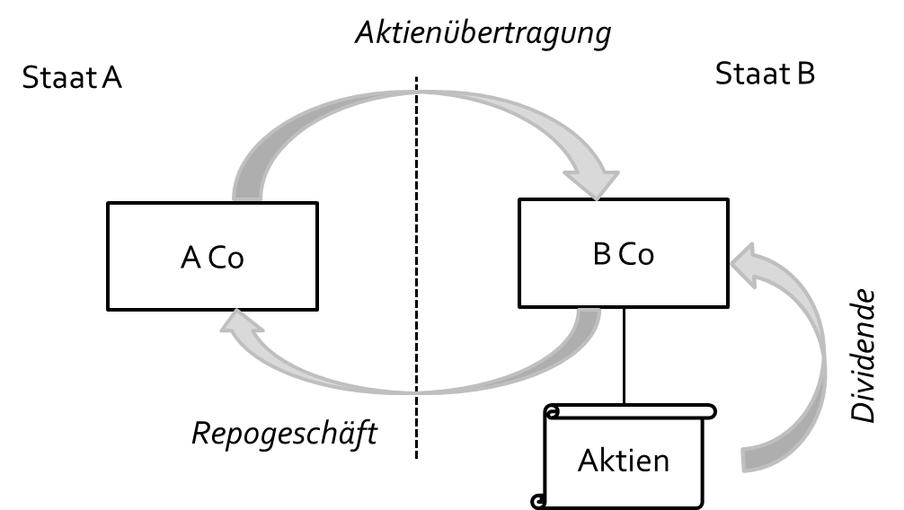 Die im Staat A ansässige A Co nimmt von der im Staat B ansässigen B Co ein Darlehen in Form eines Repo-Geschäfts auf. Im Rahmen des Repo-Geschäfts überträgt A Co Aktien an B Co mit der Vereinbarung, diese zu einem späteren Zeitpunkt zu demselben Preis zuzüglich Repozinsen wieder zurückzukaufen. Der vereinbarte Preis ist um die während der Kreditlaufzeit auf die Aktien von der B Co erhaltenen Ausschüttungen zu kürzen.
