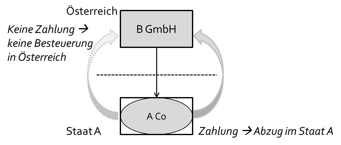 Es erfolgt eine Zinszahlung der im Staat A ansässigen A Co an ihre 80-prozentige Gesellschafterin, die in Österreich ansässige B GmbH, für ein Gesellschafterdarlehen. Die A Co wird im Staat A als intransparent (Steuersubjekt) behandelt; für die Zahlung wird ein Abzug zugelassen. Aus österreichischer Sicht wird die A Co als Personengesellschaft eingestuft und davon ausgegangen, dass im Staat A eine (anteilige) Betriebsstätte für die inländische Gesellschafterin B GmbH begründet wird. Das DBA zwischen Österreich und Staat A sieht für Betriebsstättengewinne die Befreiungsmethode vor. Es erfolgt daher keine steuerliche Berücksichtigung der Zahlung bei der Gesellschafterin B GmbH im Inland, weil die Zinsen als Sonderbetriebseinnahmen behandelt werden und als Teil des Gewinns der Betriebsstätte im Staat A in Österreich der Befreiungsmethode unterliegen.