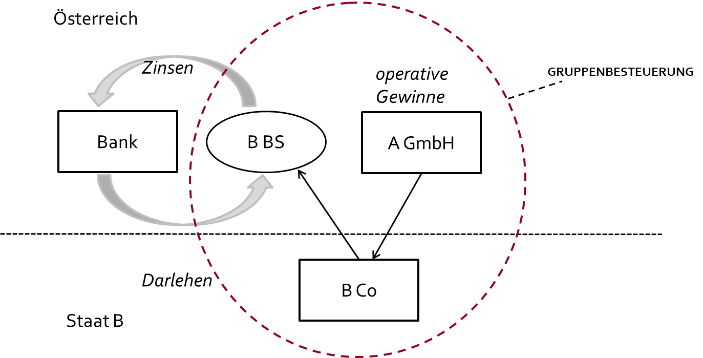 Die doppelt ansässige Körperschaft B GmbH mit Sitz in Österreich und Ort der Geschäftsleitung im Staat B ist Gruppenmitglied einer inländischen Unternehmensgruppe mit der A GmbH als Gruppenträgerin. Der inländische Betrieb der B GmbH stellt abkommensrechtlich eine Betriebsstätte B BS dar. Nach dem DBA zwischen Staat B und Österreich ist Staat B der abkommensrechtliche Ansässigkeitsstaat der B GmbH und Österreich der abkommensrechtliche Quellenstaat. Das DBA sieht für Betriebsstätteneinkünfte die Anrechnungsmethode vor. Die B GmbH hat bei einer Bank in Österreich ein Darlehen aufgenommen, das der Betriebsstätte B BS in Österreich zugeordnet wird. Die B GmbH erzielt im Inland einen Verlust; dieser wird im Rahmen der Gruppenbesteuerung mit Einkünften der Gruppenträgerin A GmbH (somit mit nicht doppelt berücksichtigten Einnahmen) verrechnet. In Staat B wird der inländische Verlust als Betriebsstättenverlust aufgrund der Anrechnungsmethode ebenfalls angesetzt und mit anderen Einkünften der doppelt ansässigen B GmbH verrechnet.