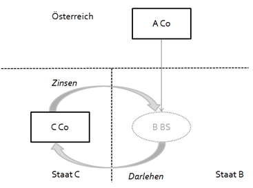 Die in Österreich ansässige Körperschaft A Co gewährt der im Staat C ansässigen Körperschaft C Co ein Darlehen. Die C Co tätigt dementsprechend Zinszahlungen, die in Staat C als (Betriebs-)Ausgaben abgezogen werden. Aus österreichischer Sicht unterhält die A Co in Staat B (einem EU-Mitgliedstaat) eine Betriebsstätte B BS, der diese Zinszahlungen zugerechnet werden. Das DBA zwischen Österreich und Staat B sieht die Befreiungsmethode für Betriebsstätteneinkünfte vor. Staat B geht nicht vom Vorliegen einer Betriebsstätte aus. Der Ertrag aus den Zinszahlungen wird daher auch in Staat B nicht besteuert.