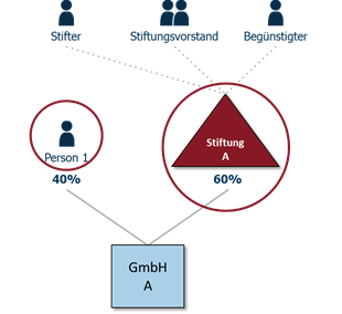 Beispiel oberster Rechtsträger (Variante 3): Die indirekten wirtschaftlichen Eigentümer der GmbH A sind jene Personen, die die entsprechenden Funktionen bei der Stiftung A (Stifter, Stiftungsvorstand und Begünstigter) ausüben. Die Stiftung A, die mit 60% ausreichend direkt an der GmbH A beteiligt ist, ist daher oberster Rechtsträger. Im Meldeformular ist im Verhältnis zur Stiftung als oberstem Rechtsträger "Kontrolle" auszuwählen. Person 1 ist direkter wirtschaftlicher Eigentümer. Liegt der Sitz der Stiftung A im Inland, dann muss die GmbH A nur die Stiftung als obersten Rechtsträger melden. Eine Meldung des Stifters, des Stiftungsvorstandes und der Begünstigten entfällt diesfalls (da deren Meldedaten automationsunterstützt aus der Meldung der inländischen Privatstiftung aus dem Register übernommen werden).