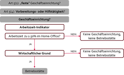 Grundsätzlich besteht nach den Ausführungen des OECD-MK also dann eine Homeoffice-Betriebsstätte, wenn die Person zumindest 50% der Arbeitszeit innerhalb eines Zeitraums von zwölf Monaten im Homeoffice verbringt und dem Unternehmen durch die im Homeoffice ausgeführte Tätigkeit einen wirtschaftlichen Grund vermittelt.