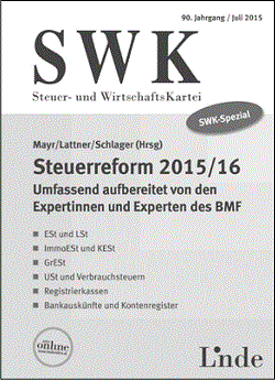 Das Steuerreformgesetz 2015/2016 bringt weitreichende Änderungen in allen relevanten Steuerbereichen. Auch wenn der Großteil der Bestimmungen erst 2016 in Kraft tritt, so wirken doch zahlreiche Maßnahmen bereits auf das laufende Jahr zurück. Insbesondere Wirtschaftstreuhänder sind daher gefordert, ihre Klienten umfassend zu beraten und so optimal vorzubereiten. Die Autoren bieten im vorliegenden SWK-Spezial eine systematische und praxisorientierte Aufbereitung, Hintergrundinfos aus der Gesetzwerdung sowie fundierte Kommentierungen aus erster Hand.