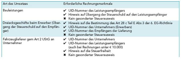 Je nach Rechnung sieht das Umsatzsteuergesetz neben den allgemeinen Rechnungsbestandteilen zusätzliche, spezielle Rechnungsangaben vor. Welche Angaben bei welcher Ausgangsrechnung anzuführen sind, wird nachstehend übersichtlich dargestellt.