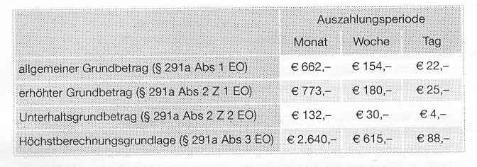 Aufgrund der Änderung des Ausgleichszulagenrichtsatzes für allein stehende Personen (§ 293 Abs 1 lit a ASVG) ab 1. 1. 2005 auf A 662,99 (§ 293 Abs 2 ASVG iVm V BGBl II 2004/460) erhöhen sich mit diesem Tag auch die Werte für die Berechnung der unpfändbaren Freibeträge iSd § 291a EO (Existenzminimum) auf die in der folgenden Tabelle genannten Beträge. Zu den Werten für das Jahr 2004 siehe ZRInfo 2003/494, für 2003 ZRInfo 2002/502.